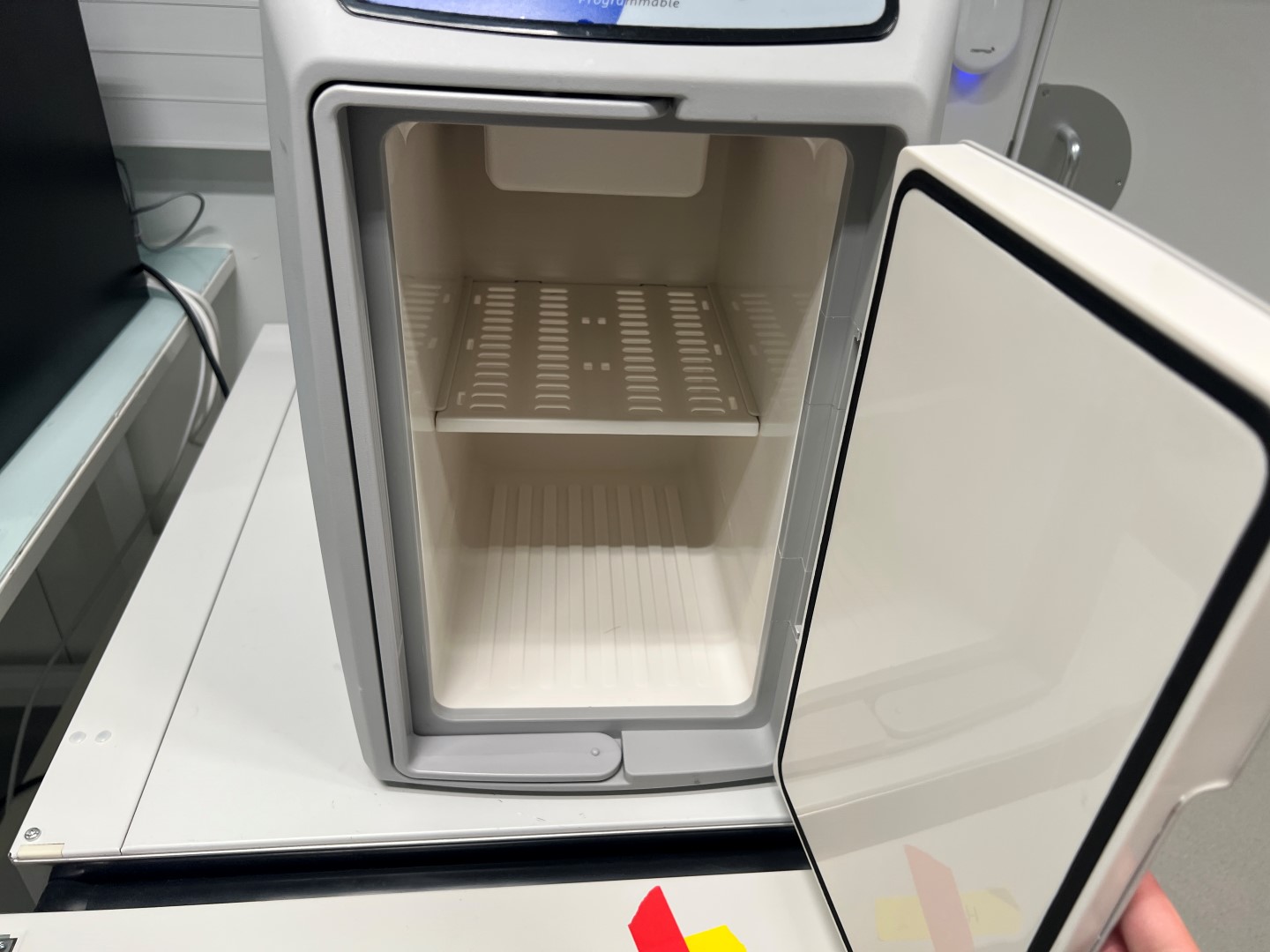 Compact portable incubator designed for laboratory use. Features a fully programmable digital controller with adjustable temperature settings via dedicated SET and MODE functions. Universal power supply (100–240V) makes the unit suitable for international use. The top-mounted ventilation system ensures uniform heat distribution within the chamber. Interior is clean, intact, with one removable perforated shelf. Unit is in very good cosmetic and functional condition.