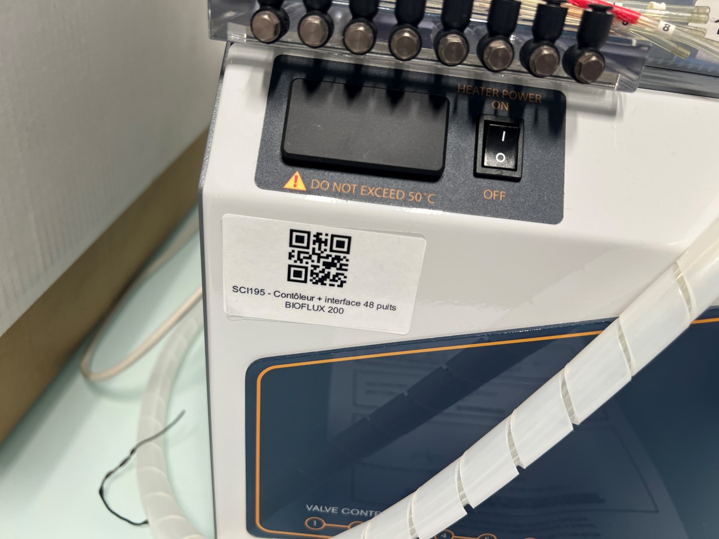 Connections: Multiple pneumatic tubing ports on top manifold (visible: dual-row valve block with luer-lock fittings); fluidic interface with color-coded pressure lines (red/black polarity markers)