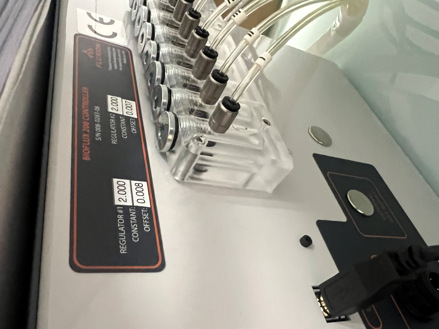 Fluidic interface assembly (transparent acrylic manifold with multiple Luer fittings, mounted on top of controller)