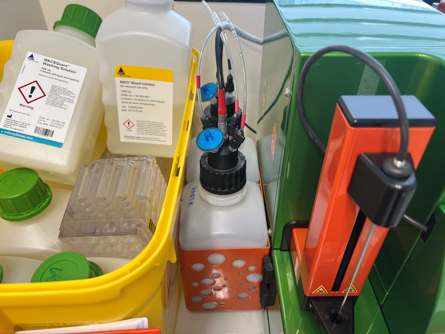 The instrument is equipped with a fully integrated pressure-based fluidics system, including a multi-head peristaltic pump assembly, valve manifold with color-coded tubing, automated stainless steel sample injection probe with Z-axis movement, and temperature-regulated sample delivery (38–41°C). The system connects to dedicated sheath fluid, washing solution, and waste/bleach reservoirs via the Miltenyi orange bottle carrier system.