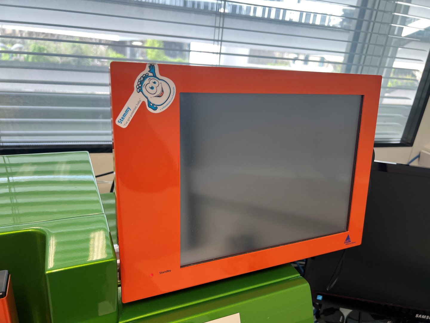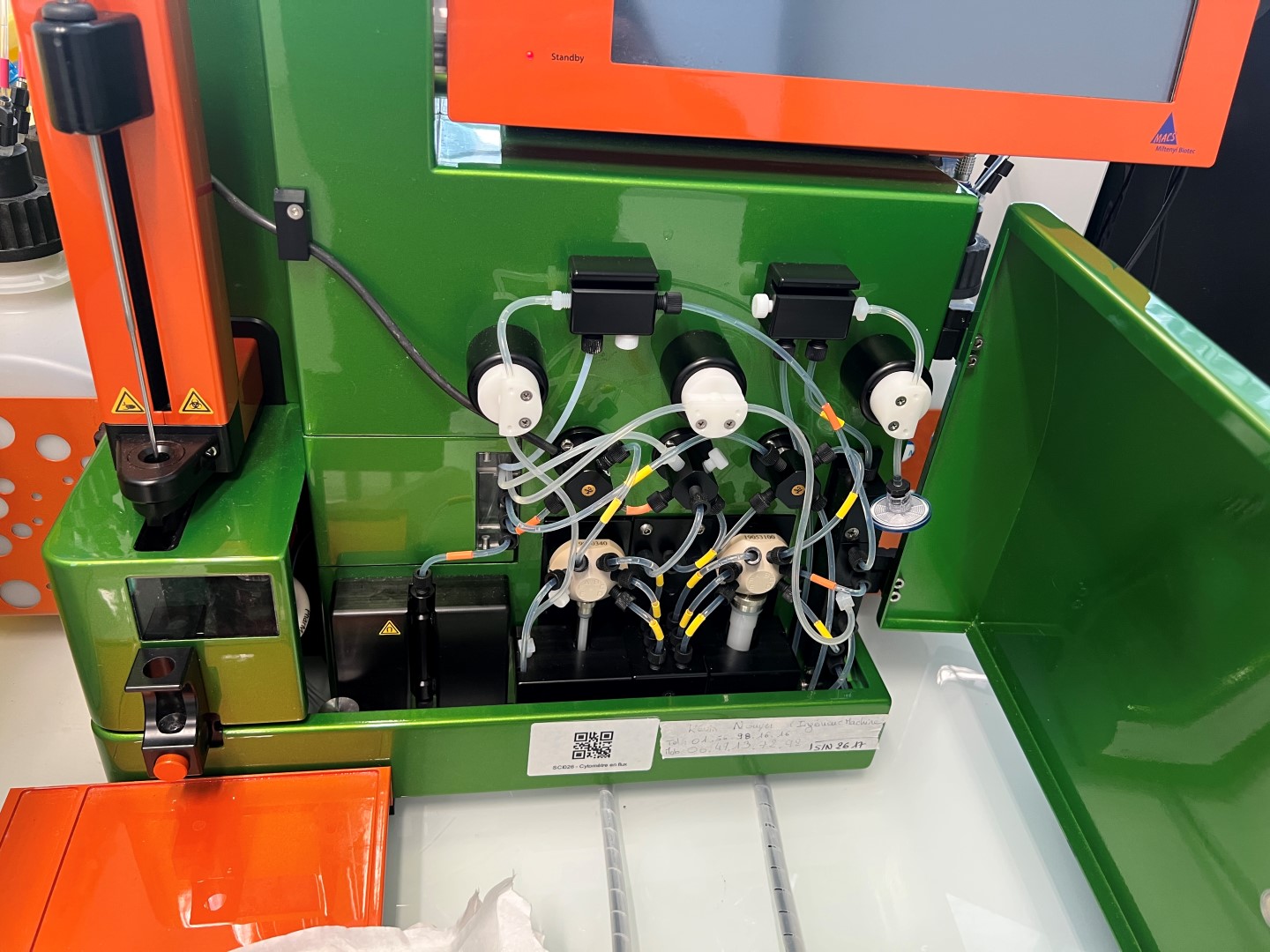 Interface: The unit includes the original Miltenyi Biotec integrated orange touchscreen display (~15″), currently in Standby mode. Control is via the MACSQuant software ecosystem.
