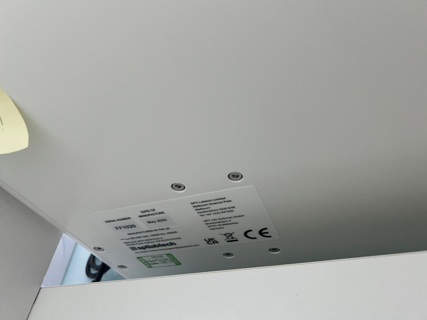 SPT Labtech Firefly® · S/N FF1020 · May 2023 · Automated benchtop liquid handler for genomics and high-throughput applications · 100–240 VAC.