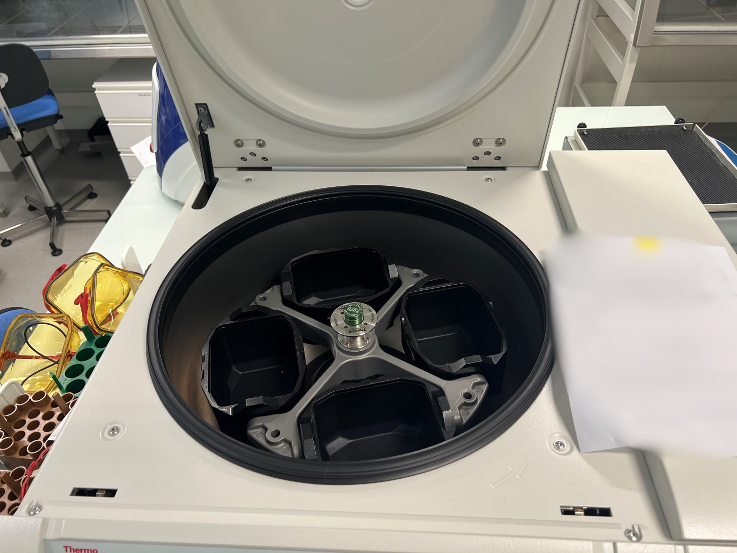 4-Position Swinging Bucket Rotor (installed) — large-format square buckets, central green locking nut. Suitable for high-volume applications.