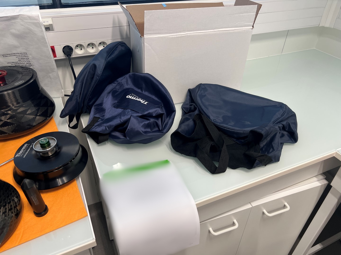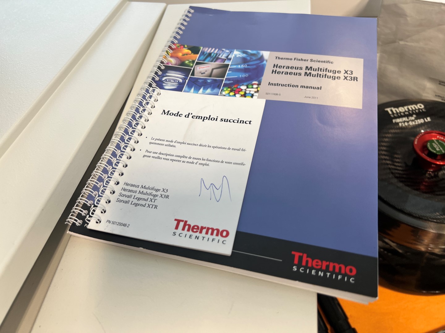 2 × Thermo rotor carrying bags, rotor tube adapters/inserts, Sigma rotor tool/screwdriver, original instruction manual (Heraeus Multifuge X3/X3R, June 2011, bilingual EN/FR), rotor care & maintenance documentation.