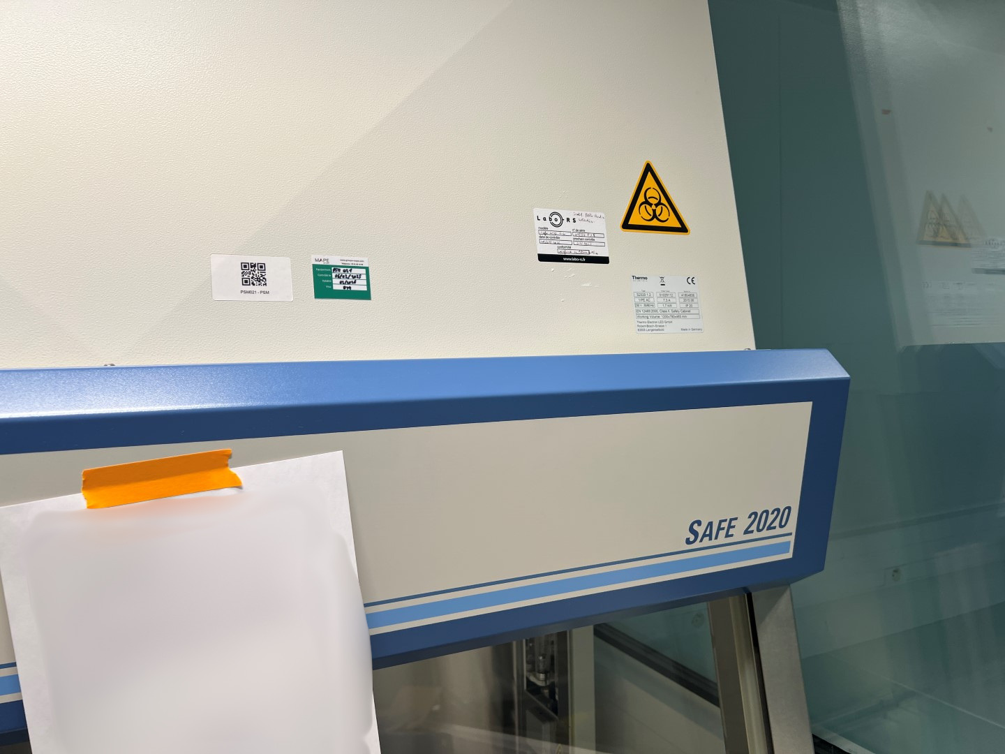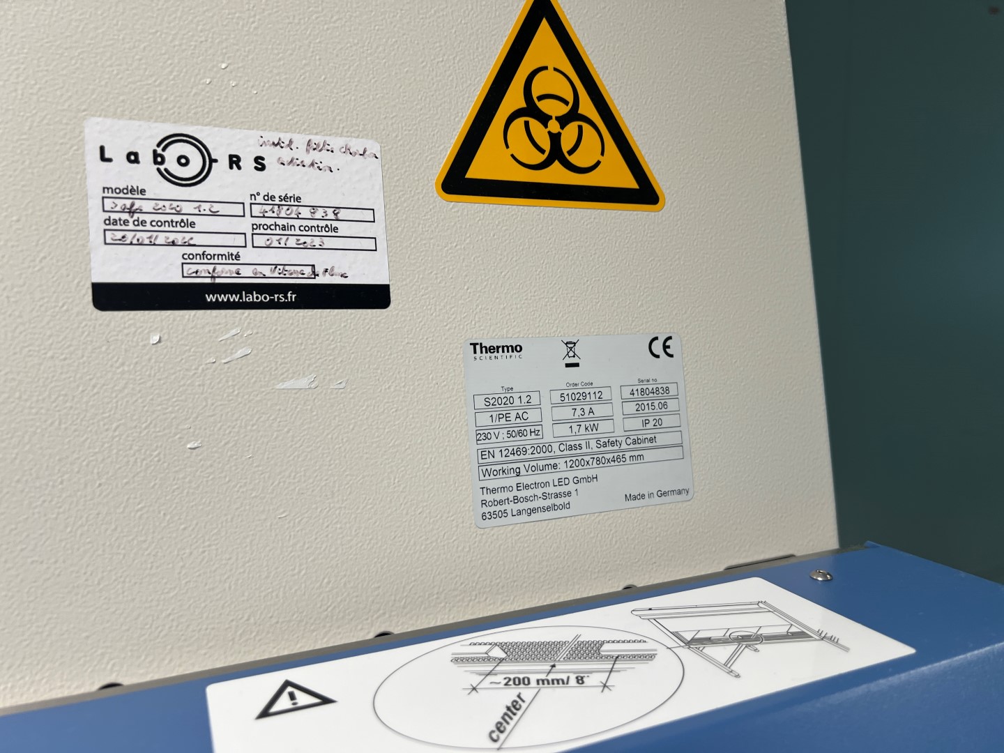 Thermo Scientific biological safety cabinet, model Safe 2020, type S2020 1.2, serial number 41804838, manufactured in 2015 in Germany by Thermo Electron LED GmbH.