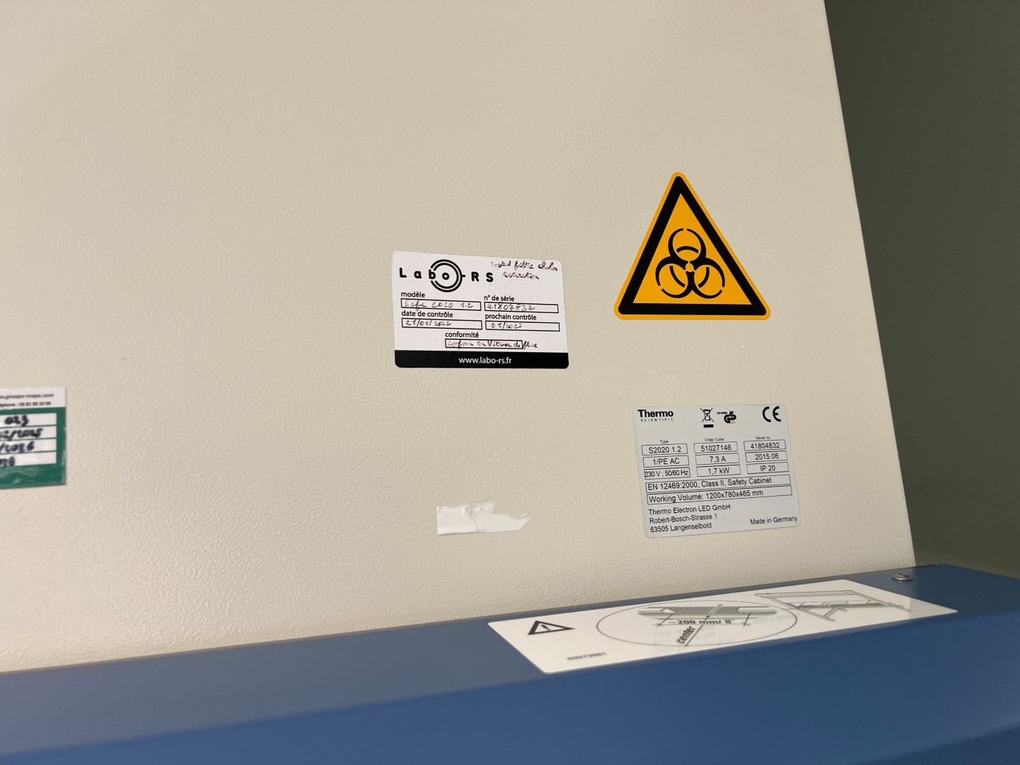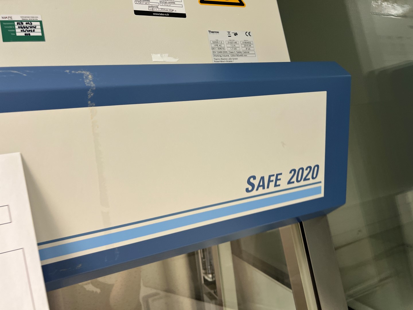Thermo Scientific biological safety cabinet, model Safe 2020, type S2020 1.2, serial number 41804832, manufactured in 2015 in Germany by Thermo Electron LED GmbH.