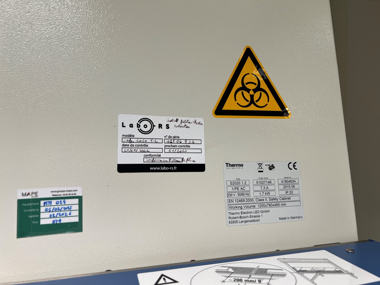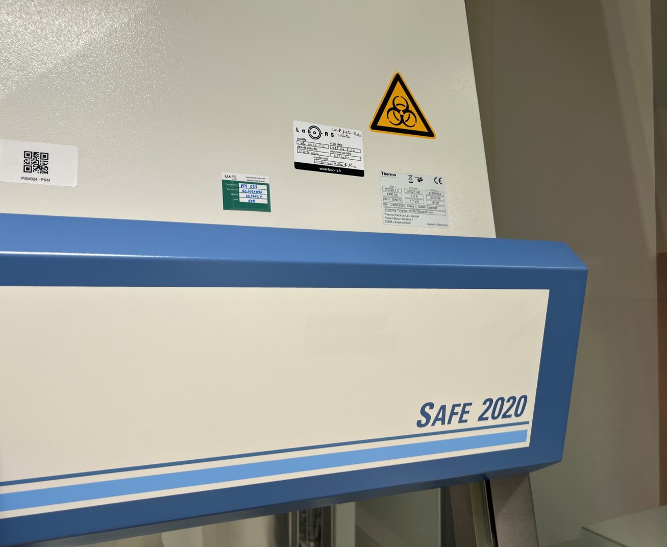 Thermo Scientific biological safety cabinet, model Safe 2020, type S2020 1.2, serial number 41804834, manufactured in 2015 in Germany by Thermo Electron LED GmbH.