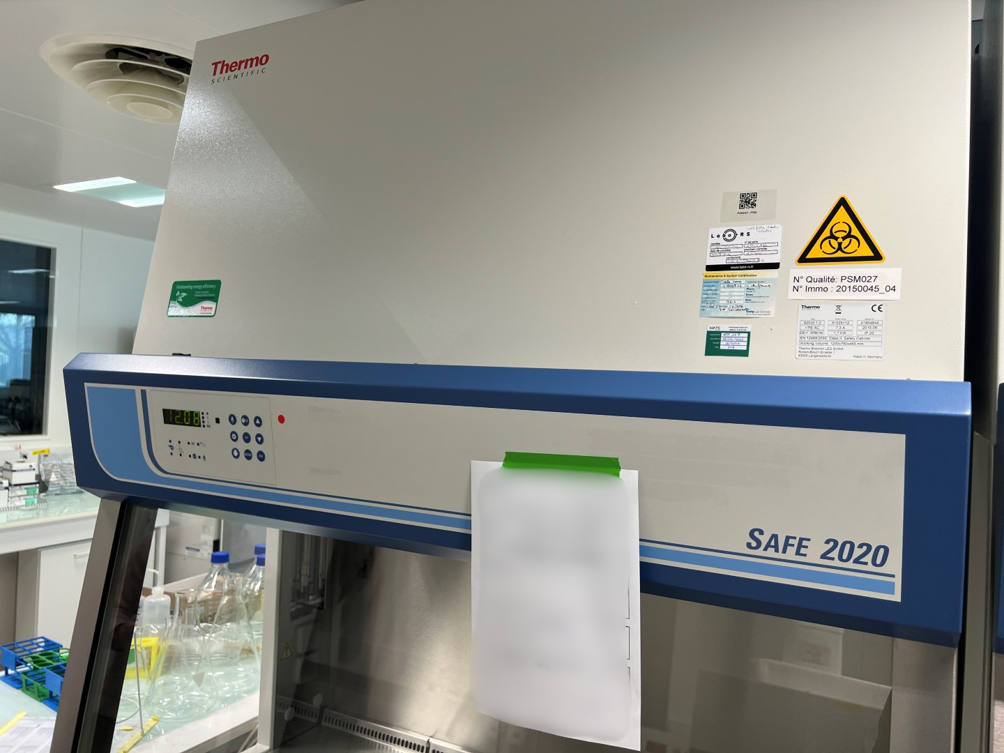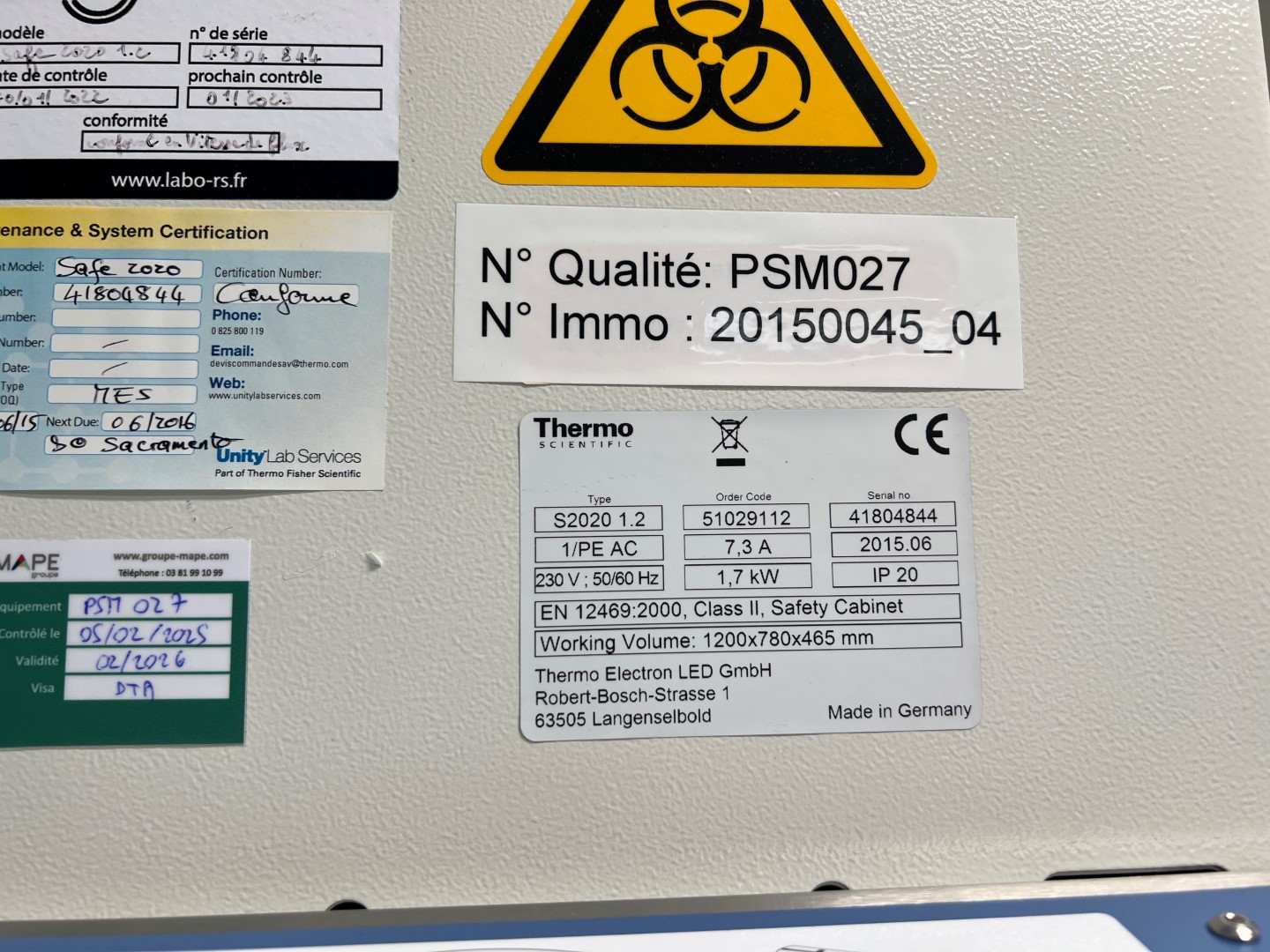 Thermo Scientific biological safety cabinet, model Safe 2020, type S2020 1.2, serial number 41804844, manufactured in 2015 in Germany by Thermo Electron LED GmbH.